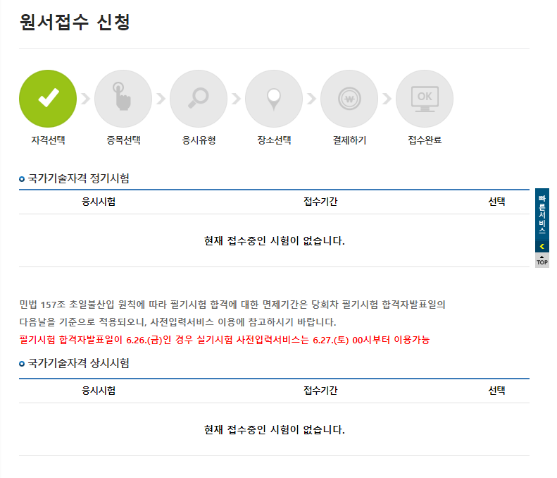 하지만, 시험 일정이 있는 날에는 응시종목-지역-시험장 선택-결제순으로 하시면 원서접수가 마감됩니다.